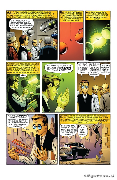 这个蜘蛛侠的起源故事,和主宇宙616地球的蜘蛛侠并没有太大的差异,也是被一只变异蜘蛛咬伤后,拥有了蜘蛛超能力。