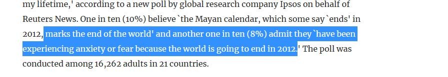 研究公司易普索针对二十一个国家1.6万成年人的调查研究报告显示,这则不知道是不是真的出自于玛雅人的末日预言,至少对全球百分之八的人造成了极大影响。尽管许多国家甚至官方出面澄清奉劝民众不要相信末日谣言,但是人们依旧选择不信,认为高层早有了逃生计划,只是为了不引起骚乱而向民众隐瞒了末日的真相.