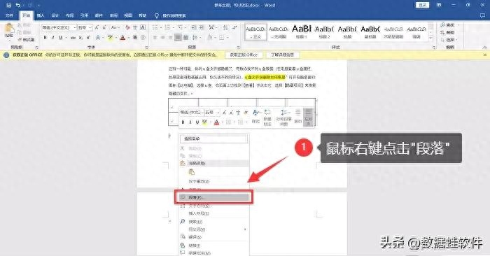 如果你的表格尾部表格,怎么删除空白页都无法删除,不妨试试这个方法。将鼠标箭头放到空白页的位置,右键单击,选择【段落】;
