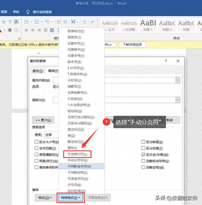 如果Word文档中有多个空白页,可以通过搜索并替换来删除它们。按【Ctrl+H】打开窗口,单击【更多】或【高级】,然后选择【特殊格式】里的【手动分页符】;