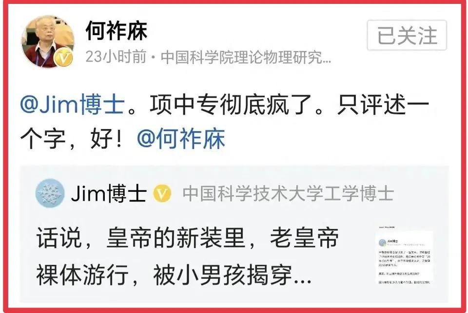 1月24日,项立刚被头条禁言,有网友发现后当作新闻传播。何祚庥看到了,专门私信项立刚进行核实,还称其“老项”,可见关系亲密。