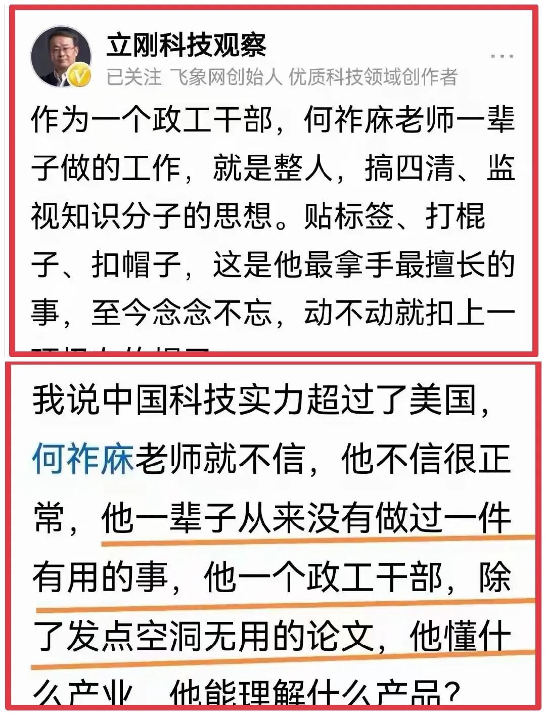 比如,项立刚曾嘲讽何祚庥的院士身份,说他没什么大贡献,“一辈子从来没有做过一件有用的事”,说他“一辈子做的工作就是整人……贴标签、打棍子、扣帽子,这是他最拿手最擅长的事”。