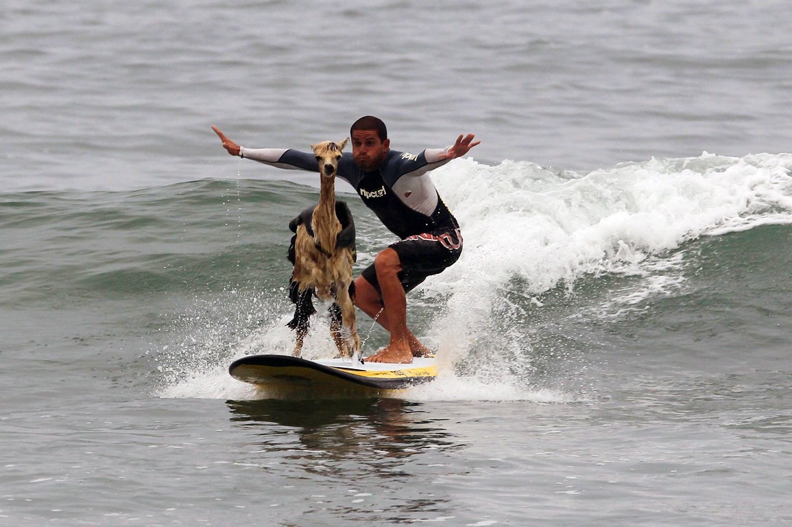 来自秘鲁的冲浪高手多明戈把一只草泥马当成家宠,为这只可爱的草泥马取名为皮斯科,有一天男主人灵机一动,为皮斯科穿上泳衣,并教他学习冲浪,经过几个月后的培训,皮斯科成了世界上第1只学习冲浪的羊驼。主人表示,训练它有一些些的困难,因为他们与狗狗不同,不会本能地跳入大海游泳,但现在皮斯科完全适应了海水,还迷上了冲浪,爱上和主人一起逐浪玩耍。