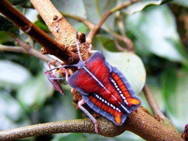 八,荔蝽,荔蝽主要分布在福建、江西、广东、广西、贵州、云南、台湾,又称放屁虫,它们遇到危险会释放一种臭液、一种强腐蚀性的臭液,这种臭液如果接触到人的皮肤,也可能导致皮肤溃烂。如果滴入眼睛,可能会造成短暂性的失明,要立即用大量清水清洗。