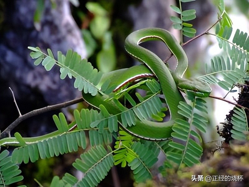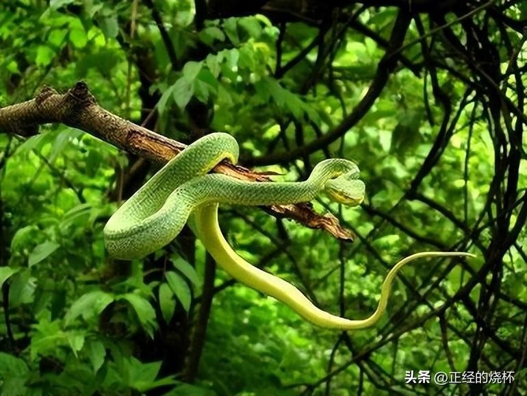下面这种毒蛇则是具有观赏性的,它们全身翠绿这也是它们的最显著的特点,俗话说越好看的事物越危险,这种蛇也是蕴含毒性的,它们就是竹叶青蛇。