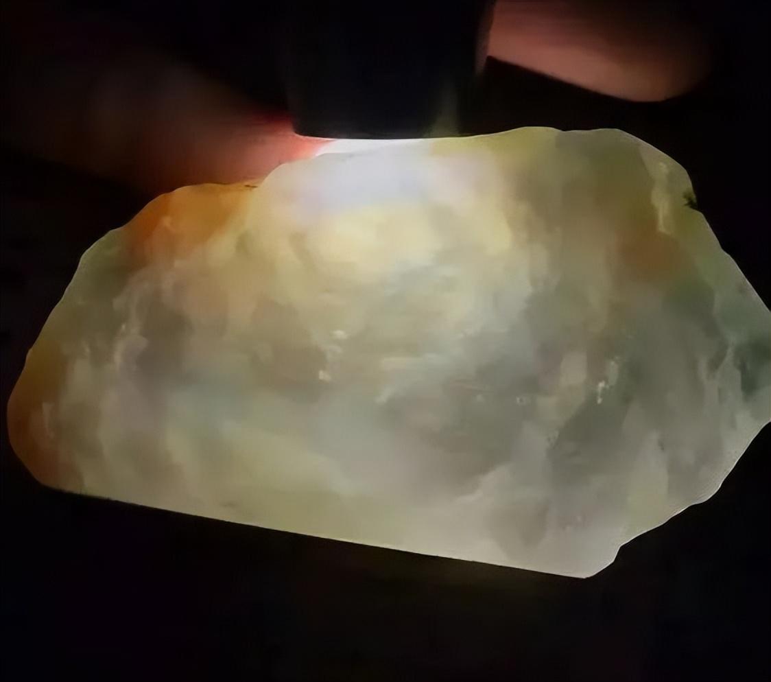 大马坎翡翠砾石多为白砂皮和黄砂皮,大部分的形状都是像芒果一样,由于长时间的河水冲刷和浸泡,皮壳大部分比较光滑,这个场口的翡翠原石肉质颜色比较丰富,透明度也是比较高的,回到这块原石上,整体