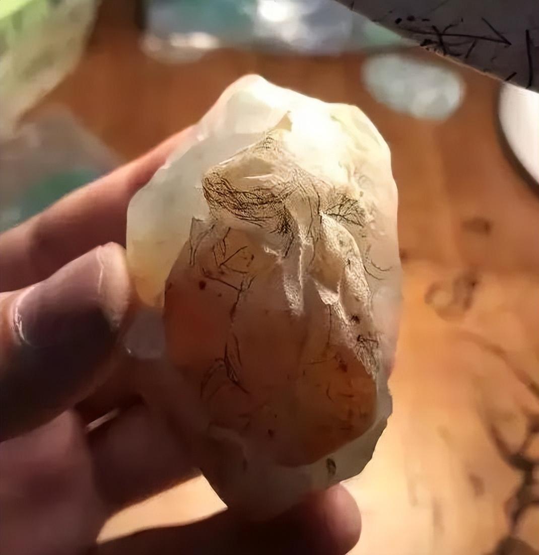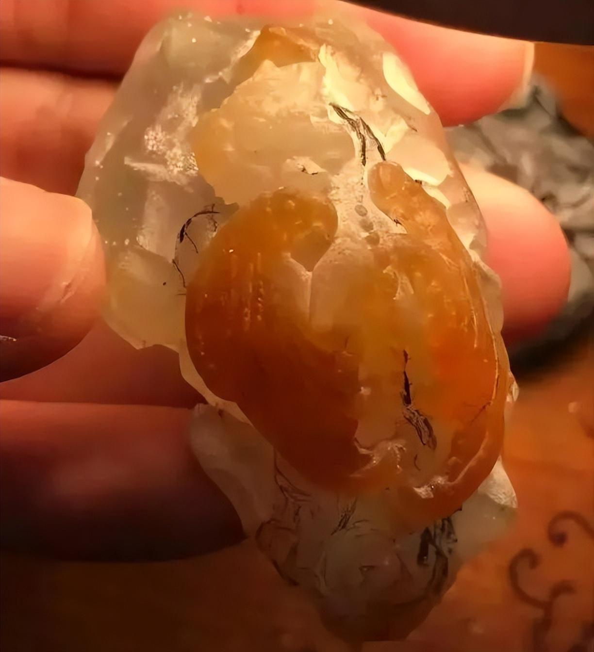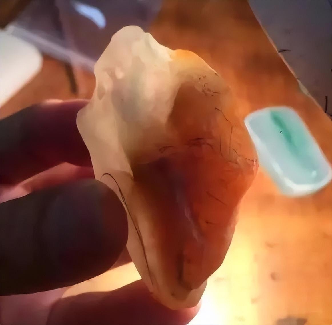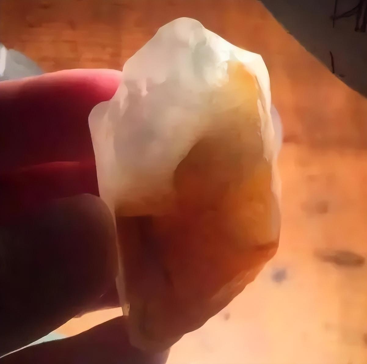 个头较小,去掉皮壳能看到种水非常完美,无纹无裂,可以整块雕刻一件作品,形状类似小手把件或者大的挂件。