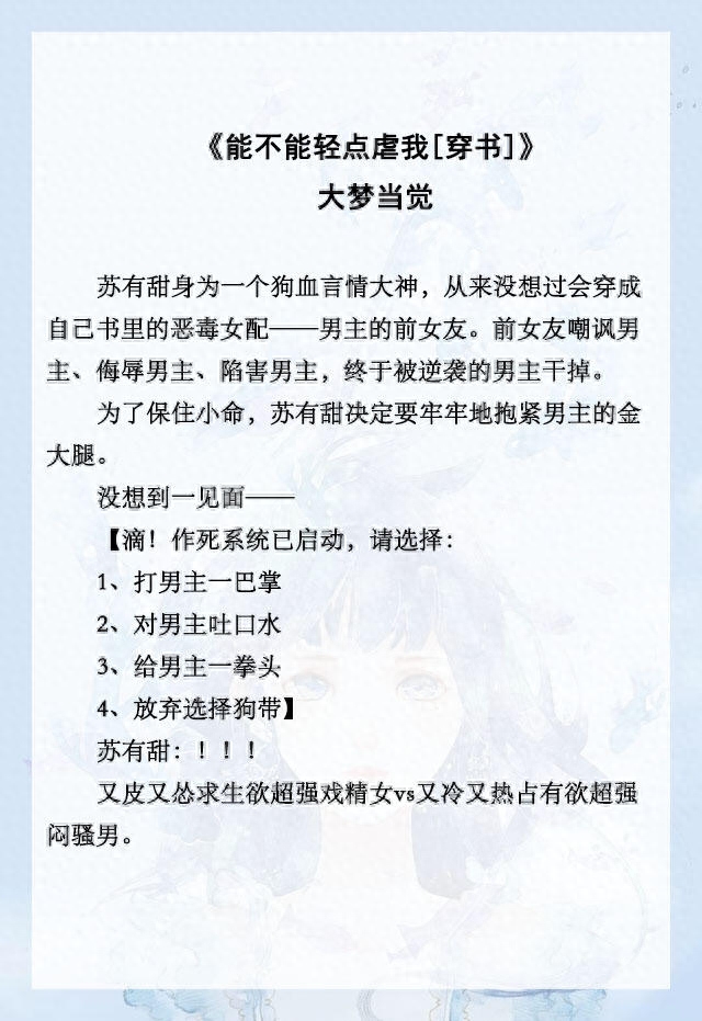 短评:穿书系统文,女主活泼可爱元气满满,本是身家千万的网文大神,却不幸被分手,一气之下把笔下的女主写黑化了,后来她穿成了小说里不断作死结局惨不忍睹的心机女配,还不幸绑定了作死系统。