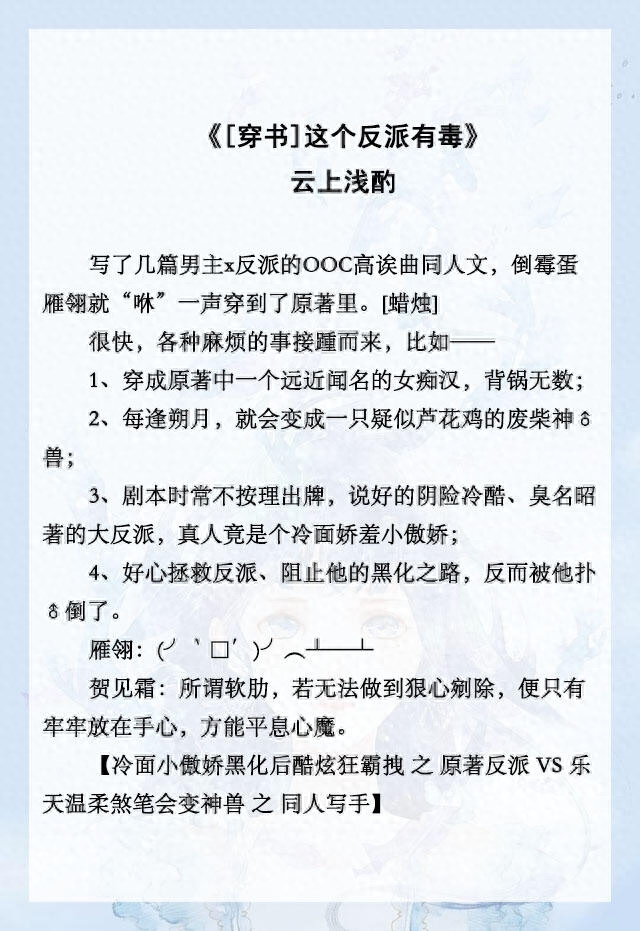 短评:穿书古言仙侠文,女主乐天派戏精一枚,在现代是同人文写手,写了原男主和反派不可描述的小说,导致反派怨气过重,时空扭曲,将始作俑者也就是女主吸到了书里。女主只有等反派老老实实迎来死翘翘的大结局,才能回到原世界。