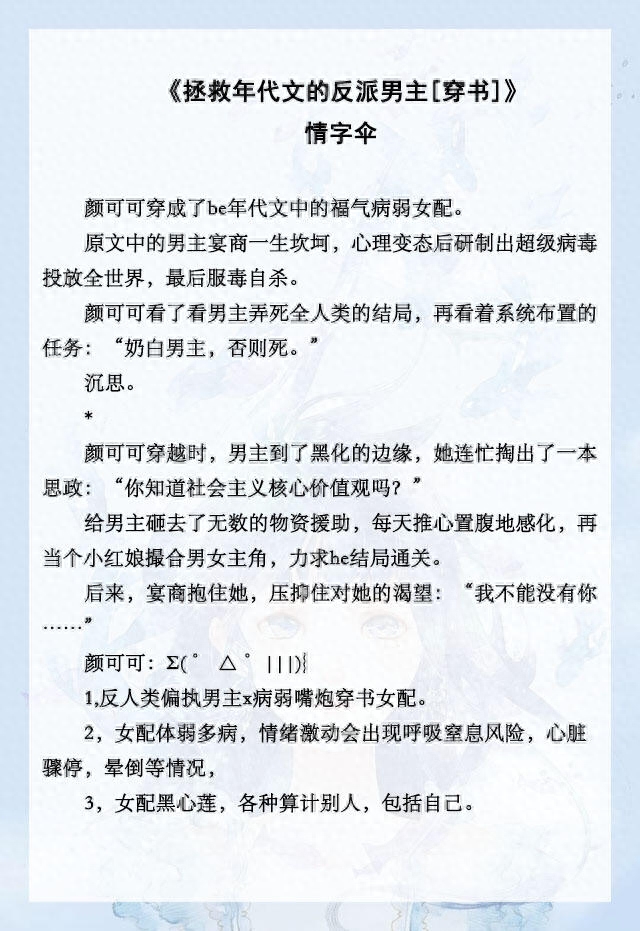 不过,原主死在反派前头,而且是被反派间接害死的,所以女主必须在反派歇菜前保住自己的小命,否则就永远回不去了。保险起见,女主打算跟反派搞好关系,不料女主却爱上了他,舍不得他死,便改变了剧情~说起来男主也是个可怜人,仿佛天煞孤星,好在有女主治愈他。
