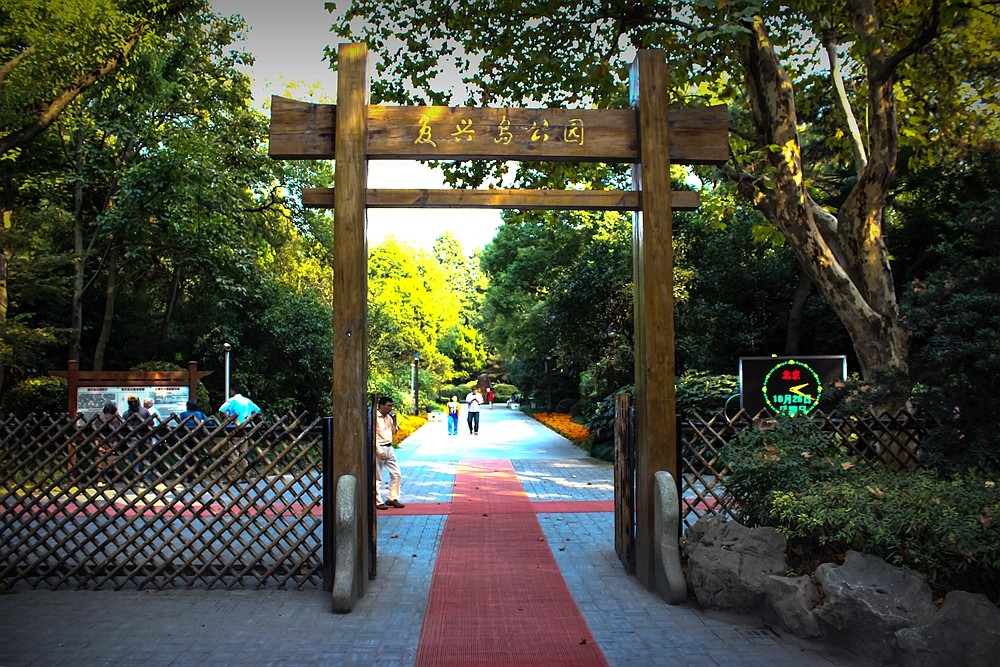 穿过竹篱笆围着的简约木门,便进入了公园内。复兴岛公园是上海的一个老公园,位于杨浦区东部,黄浦江下游,距吴淞口6公里,东、南、北三面临黄浦江,西是复兴岛运河。公园总面积4.19万平方米,始筑于1930年。初为上海浚浦局体育会。1949年以后由上海市港务局接管,并于1951年改建为公园对外开放。