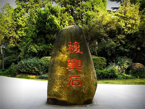 进入公园后,一直向前走,可以看到一块巨石,上书复兴石仨字,复兴石的背面刻有复兴岛的历史记录碑文。碑文如下:复兴岛公园初为上海浚浦局外籍员工俱乐部,“一二八”事变后,被日军侵占改作军事头目的别墅。对其园林部分按日本庭园风格进行改建,遍植樱花。抗战胜利后复归浚浦局,1945年建造“复兴岛收回纪念碑”一块,1967年被毁。上海解放后,复兴岛公园由港务局接管,上海市工务局园场管理处对园艺布局作了适当调整,增辟大草坪即行开放,公园以岛名命名。文化大革命期间,复兴岛公园曾改名为:“共青公园”,1977年复沿原名。