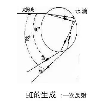 一束平行的太阳光沿图中方向射入空中的一小水滴时,由于折射而进入到水滴中且同时发生色散,然后经过一次反射再从水滴射出。由于红光在水珠中的折射率最小使其出射光线与入射光线成42度,而紫光在水珠中的折射率最大使其折射光线与入射光线成40度。