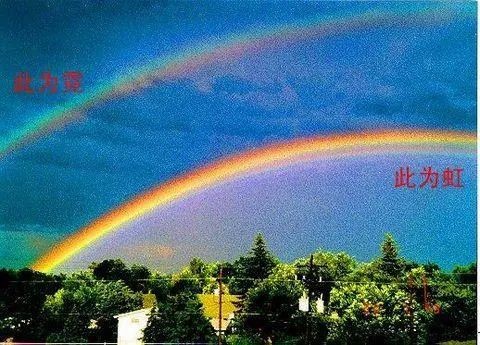 虹(rainbow),即彩虹,是红色在外,紫色在内。霓(secondary rainbow),也称二级虹。霓的色彩正好与虹相反,即外圈是紫色,内圈是红色。