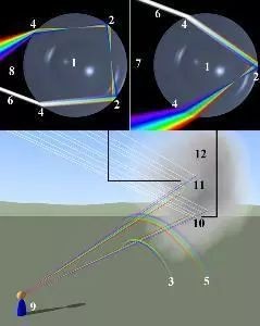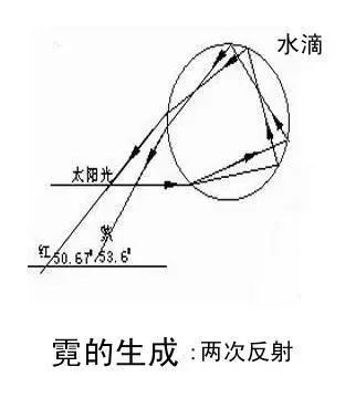 当一束太阳光射入一小水滴发生折射而在水滴内发生两次全反射时,折射率小的红光的出射光线方向与入射方向成50.6度。折射率大的紫光的出射方向与入射方向成53.6度。人眼根据视觉的直线特性而将观察到射出水滴后的光线在空中形成外侧成紫色而内侧成红色的彩色分布。