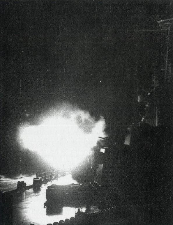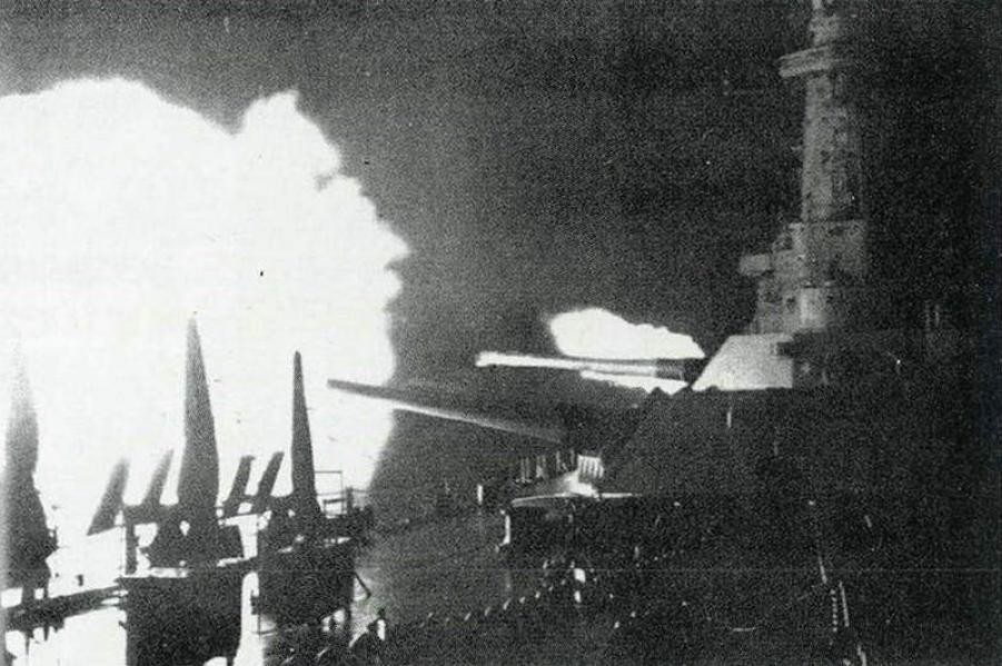 爱宕号、高雄号、雾岛号都将炮口对准了被大火映衬的极其显眼的南达科他号。23点50分左右,众炮齐鸣,一堆炮弹划破夜空发出凄厉的呼啸朝南达科他号飞去。
