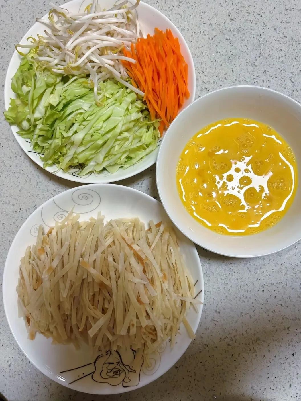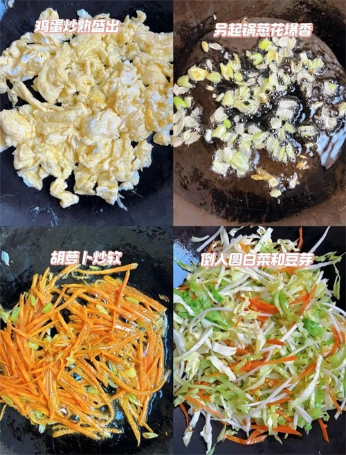 菜配:圆白菜/包菜 半颗(切细丝)、绿豆芽 100g、胡萝卜半根(切丝)、鸡蛋2个