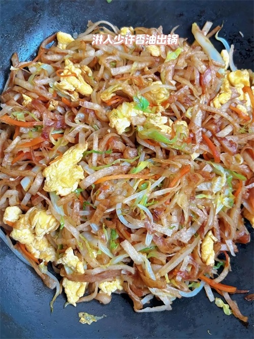 3. 喜欢焦脆感可先将饼丝干煸至微黄,再混合配菜。