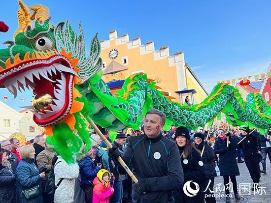 他们有的穿着自行设计的旗袍马褂,边走边向观众分发糖果和热红酒;当地管乐队穿着憨态可掬的熊猫服装,吹奏起巴伐利亚民歌;由当地社团组成的舞龙队,吸引了很多小朋友的注意,领头的德国大叔还把龙头放低,跟小朋友亲切互动;由旅德华人组成的华星艺术团方阵,凭借各色中国民族服装展示,赢得了观众的热烈掌声。