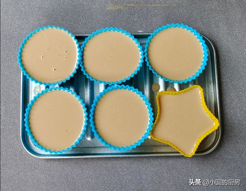 5、准备六个小模具,把拌匀的面糊倒进去,也可以用小碗或是纸杯,不过,不能装的太满,装的太满,提高了高度,那么后面烤的时间就会相对延长