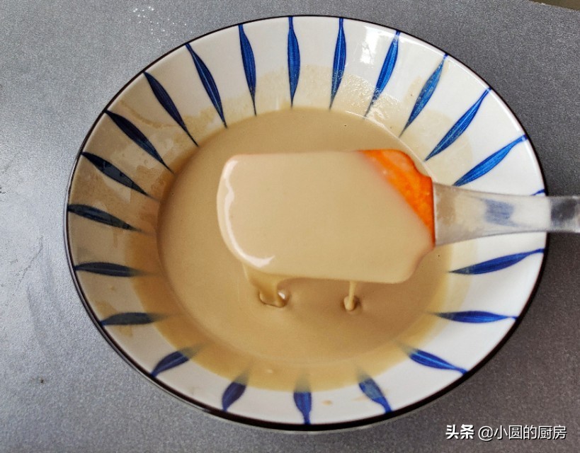 4、用刮刀切拌均匀,拌好之后还会有一些小颗粒,所以我们要将它过筛一遍,最后得出来的面糊,非常的细腻,这个样子就可以了