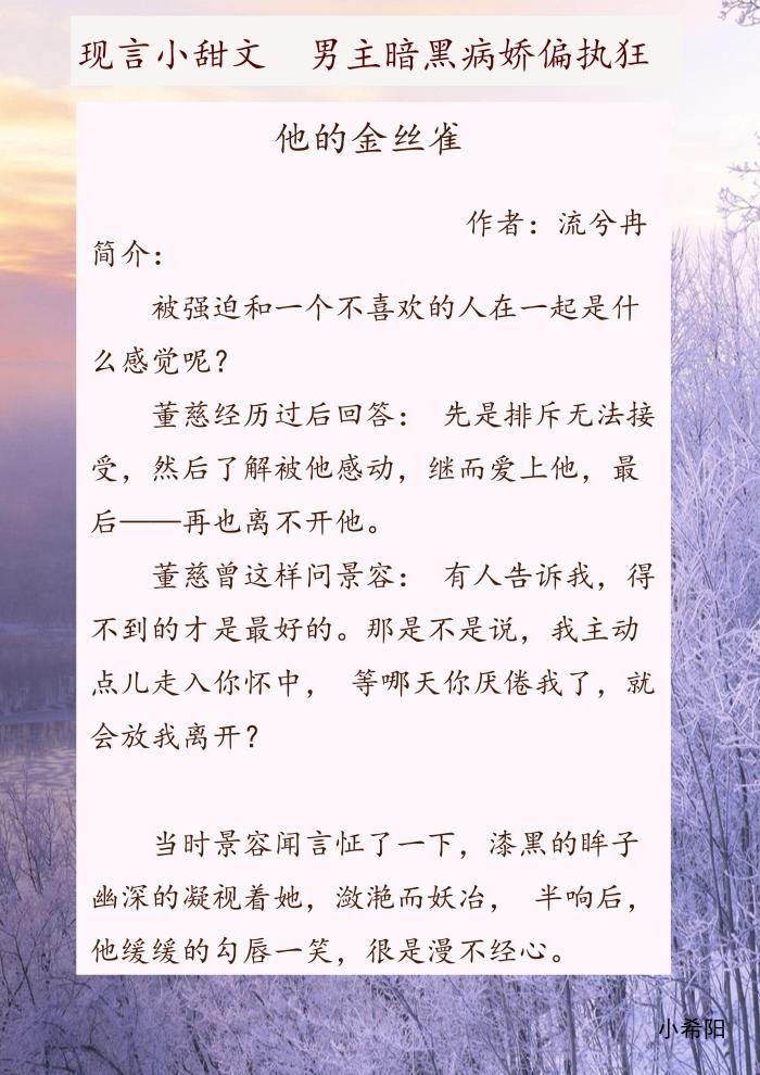 简要概括:男主偏执占有欲强,对自己想得到的猎物,会撒下网,等着猎物钻进来,让她再也不想出去,给她无尽的宠爱,果然,强迫的人要长得帅,颜值始于源头,无尽的宠爱,把自己的小仙女宠到天上去。