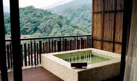 度假村的客房是被山和水包围的竹屋别墅,一打开窗户,就能看到碧绿的山川和溪流。 每个别墅都有高山温泉泡池,淋浴,景观阳台。 躺在浴池里,还看到了满天的星斗。