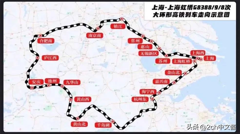 上海-上海虹桥大环形高铁开行后,日本网民发帖吐槽“中国桑开行谜之线路的环状高铁玩”(【悲報】中国さん、環状新幹線なる謎の線路を作って遊び始める),一圈1200km。上海—上海虹桥的超级环线高铁横跨沪苏浙皖,串联了上海、南京、合肥、杭州4座城市。