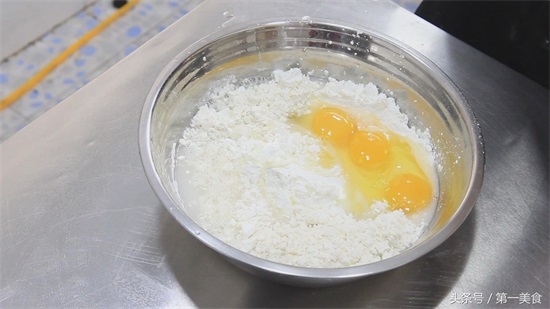 拿一个小盆放入面粉300克,打入鸡蛋三个,四个,五个都可以的。