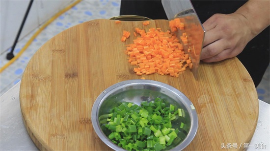 胡萝卜一段,先切成细条,再切成粒和小葱放在一起。