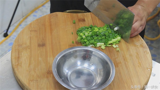在等待的时间,我们小葱一小把,切成葱花,放在盆里。