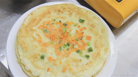 然后放入胡萝卜粒和葱花,晃动平底锅。使面饼不粘锅,一面煎黄以后,翻过来煎另一面,