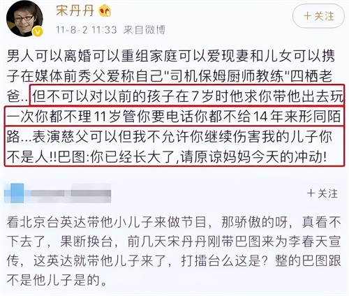 “男人可以离婚可以重组家庭,可以爱现妻和儿女,可以携子在媒体前秀父爱,称自己司机保姆厨师教练"四栖老爸。但不可以对以前的孩子在7岁时,他求你带他出去玩一次你都不理,11岁管你要电话你都不给,14年来形同陌路。表演慈父可以,但我不允许你继续伤害我的儿子,你不是人!”