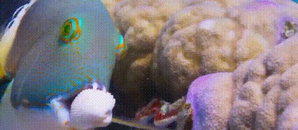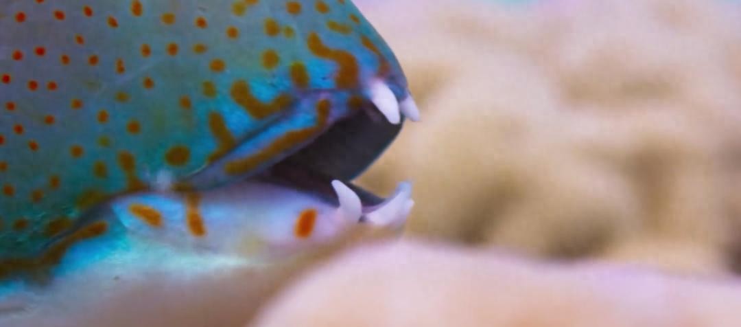 猪齿鱼用它那酷似猪齿的上下四齿紧紧咬住蛤蜊,用力将蛤蜊甩向“珊瑚厨房”的凸起处,想要砸开蛤蜊壳,然而这并不是一件容易事。角度、力量等多种因素都会影响到猪齿鱼的发挥。
