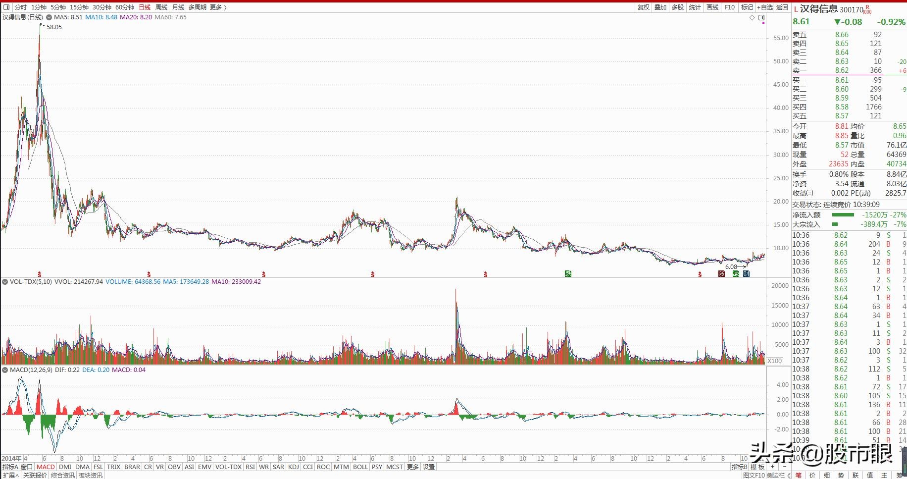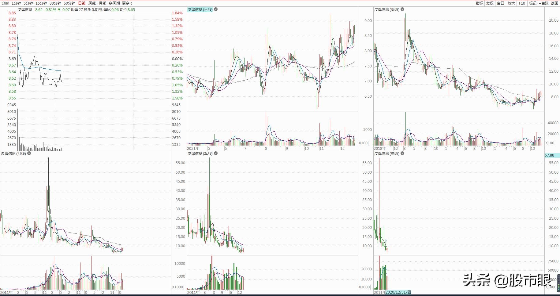 我们最后再从技术来看看汉得信息,公司2011年上市,每股发行价25.32元,送转股次数5次,股本扩张6.64倍。最高涨到58.05元,最低额跌到6.08元。从日周月季年K线来看,股价还处于底部上下震荡盘整期。