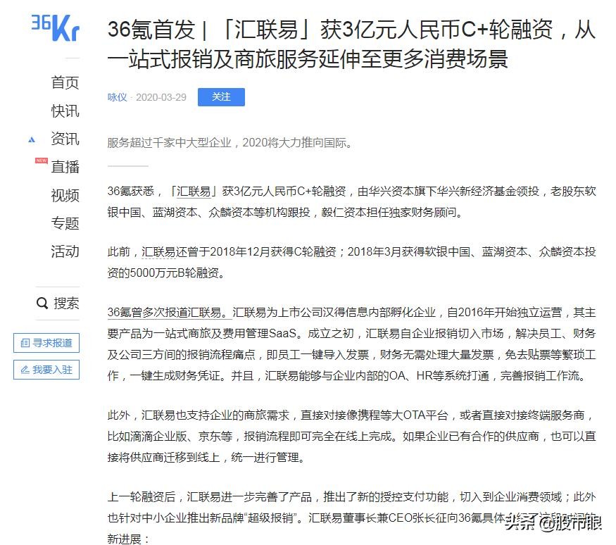 36氪获悉,「汇联易」获3亿元人民币C+轮融资,由华兴资本旗下华兴新经济基金领投,老股东软银中国、蓝湖资本、众麟资本等机构跟投,毅仁资本担任独家财务顾问。