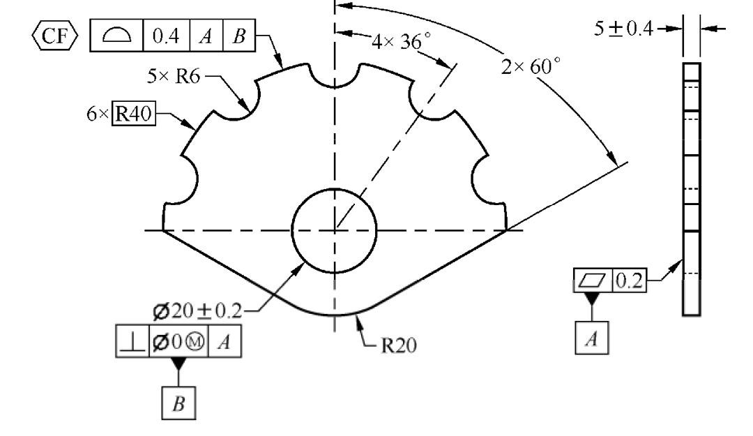 连续要素符号标注示例(三)如图1‑33所示,连续要素符号应用在轮廓度公差框格附近,表示被断开的6个表面当作单一的表面,在轮廓度0.4的公差带里。这相当于6个表面没有断开,当作一个大表面整体进行管控。