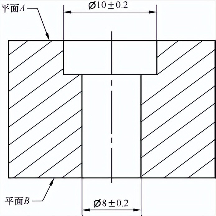 包容原则中尺寸公差只管控形状公差图纸标注示例(孔),如图1‑41所示,尺寸公差Ø10±0.2和尺寸公差Ø8±0.2只管控两个孔的形状公差,即孔的圆柱度、圆度或直线度。