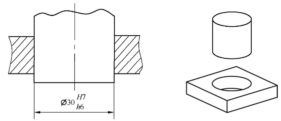 包容原则一般应用于孔轴配合,保证配合性质。特别是配合公差较小时,如最小间隙或最大过盈的精密配合。要想保证孔轴配合有一定的间隙量和过盈量,孔和轴的实际配合表面都不能超过自己的最大实体包容边界。包容原则很好地保证了这一功能要求。包容原则应用之孔轴配合标注示例如图1‑40所示,孔和轴的最大实体尺寸都是30,在包容原则规定下,孔和轴的实际表面都不会超过自己的最大实体包容边界尺寸30,从而保证了标注所示的公差配合功能。