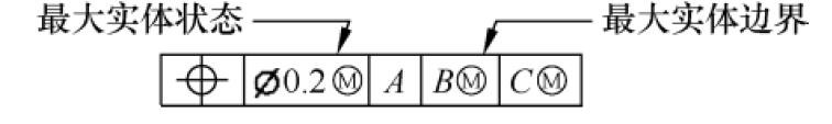 最大实体符号标注示例如图1‑29所示。最大实体符号可以标注在公差后面,也可以标注在基准后面,标注在公差后面叫作最大实体状态(MMC),标注在基准后面叫作最大实体边界(MMB)。