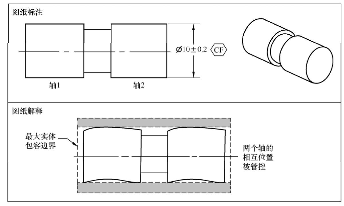 连续要素(CF)与包容原则图纸标注示例如图1‑43所示,两个直径尺寸为10的轴,理想状态是同轴,图纸标注在尺寸公差后面加了连续要素符号(CF)。由连续要素符号的定义可知,左右两个轴应该当作一个连续的轴整体管控,在包容原则下,就要用一个尺寸为10.2的最大实体包容边界同时把两个轴包在里面,两个轴的实际外表面不能超出最大实体包容边界。当两个轴的实际横截面尺寸处处都等于最大实体尺寸10.2时,两个轴不仅要求自身的形状理想,而且相互位置也要理想,不允许有同轴误差。当其中一个轴的非关联实际包容配合面尺寸小于最大实体包容边界尺寸10.2时,就允许两个轴有同轴度误差即相互位置误差,其值就等于轴的非关联实际包容配合面的尺寸与最大实体包容边界尺寸的差值。综上所述,规则尺寸要素加上连续要素符号(CF),在包容原则下就可以管控几个连续的规则尺寸要素的相互位置关系了。