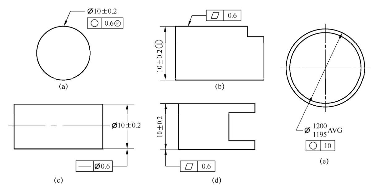 在图1‑47的(b)中,尺寸公差后面标注表示公差原则采用独立原则,形状公差可以大于尺寸公差,可以不遵循包容原则要求。在图1‑47的(c)中,直线度管控轴的中心线的形状误差,图纸标注表示即使轴在最大实体(MMC)时,也可以有0.6的形状误差,不需要保持形状理想状态,可以不遵循包容原则要求。在图1‑47的(d)中,平面度管控板的中心面的形状误差,图纸标注表示即使板在最大实体(MMC)时,也可以有0.6的形状误差,不需要保持形状理想状态,可以不遵循包容原则要求。在图1‑47的(e)中,在尺寸后面加AVG表示平均尺寸,可以不遵循包容原则。
