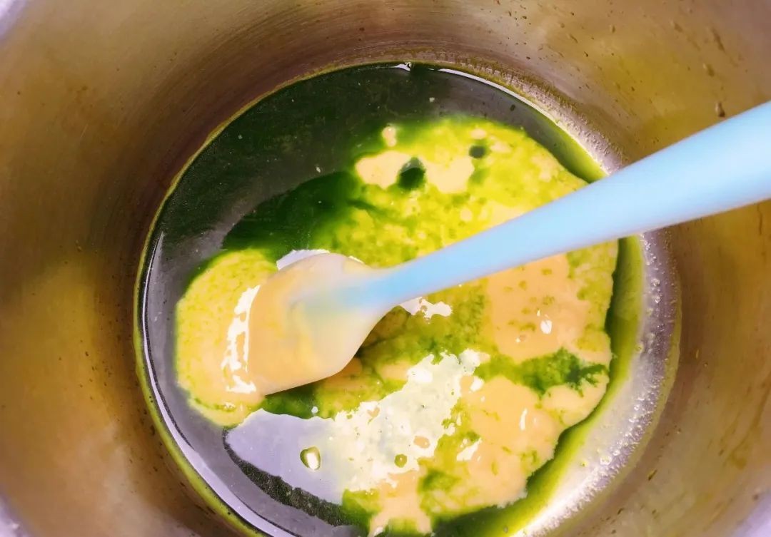 9、重复之前的过程,取另一份蛋白霜,先盛1/3到菠菜蛋黄糊里,拌匀,然后全部倒回,翻拌均匀。菠菜蛋糕糊就做好了~