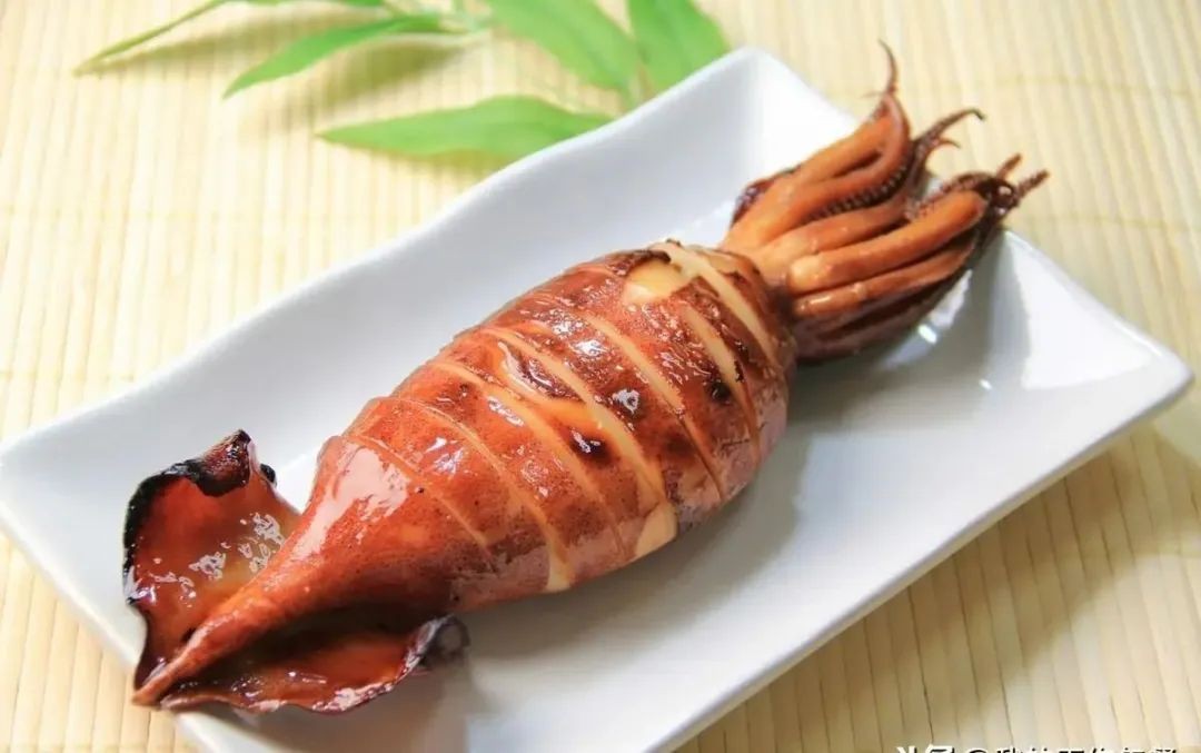 4、将腌制好的鱿鱼放入烤箱中,220度十分钟,取出来再次涂酱汁,再烤3分钟后取出即可。