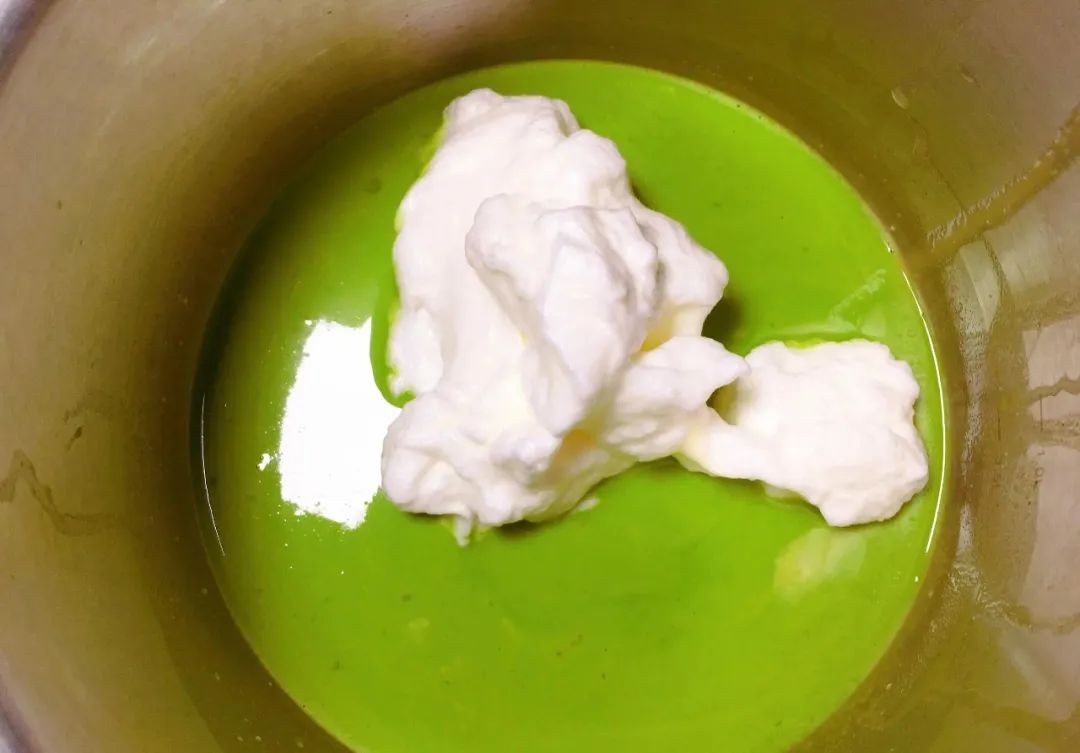 5、然后将第四部平均分成两份,分别加入菠菜汁和酸奶,搅拌均匀,备用