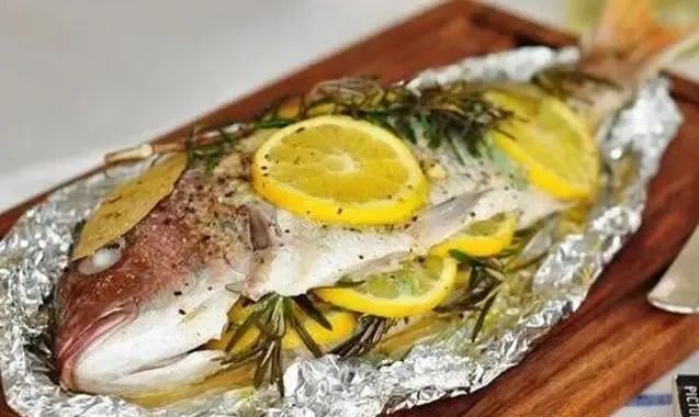 4、把整条鱼用锡纸包裹起来,烤箱预热200摄氏度,上下火烤30分钟左右。