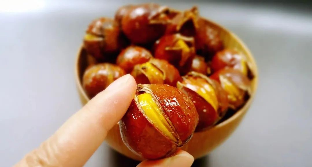 5、栗子拿出烤箱,用刷子蘸糖水刷栗子表面,栗子裂开处多刷点,刷好糖水后再入烤箱烤5分钟左右即可(因为每家烤箱不同,可以先尝一个,再根据口感是否延长烘烤时间)