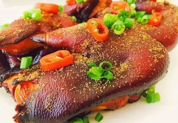 6、把煮熟的猪蹄夹出来,烤盘铺上油纸,带皮那面朝上,均匀码放在烤盘上,上下火180或者200度,放进烤箱烤一刻钟取出,烧烤粉均匀撒在上面再进烤箱,继续烤5分钟。喜欢焦一点的可以适当延长时间。烤好后装盘撒香菜碎或者葱花。