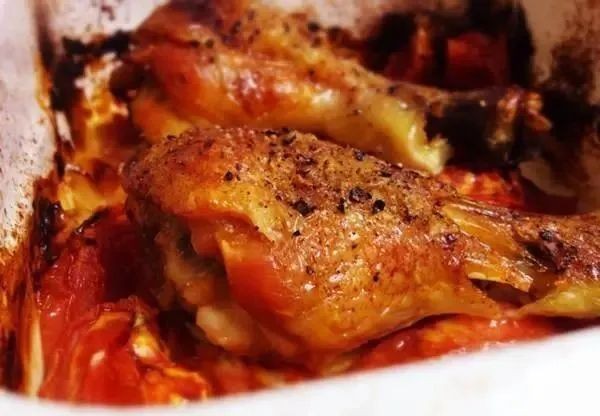 鸡腿、蕃茄、大蒜、大葱、橄榄油、香叶、盐、胡椒粉、薄荷叶