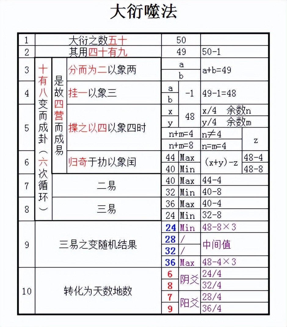 蓍草占卜法《系辞》云:“大衍之数五十,其用四十有九;分而为二,以象两,挂一以象三,揲之以四,以象四时,归奇於扐,以象闰,五岁再闰,故 再扐而后挂。